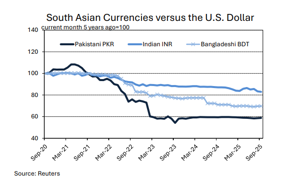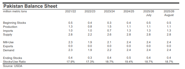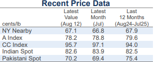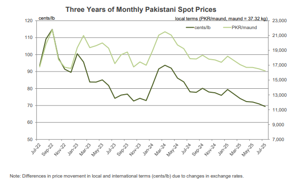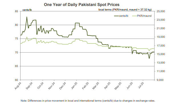 - Pakistani spot prices traded near 69 cents/lb or 16,300 PKR/maund over the past month. The PKR was steady around 283 PKR/USD.