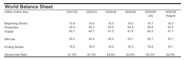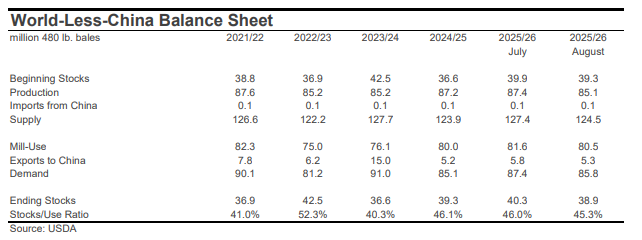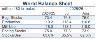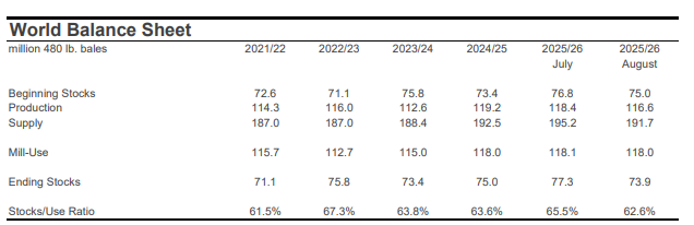 SUPPLY, DEMAND, & TRADE: In the latest USDA forecasts for the 2025/26 crop year, projections for world production (-1.8 million bales to 116.6 million) and mill-use (-135,000 bales to 118.0 million) were lowered. Historical revisions, including a +1.0 million increase for Chinese consumption in 2024/25, lowered the figure for 2025/26 beginning stocks -1.7 million bales (to 75.0 million bales). The net effect was a -3.4 million bale reduction to the projection for global ending stocks in the new crop year (to 73.9 million bales). If realized, this volume is near the average since COVID.