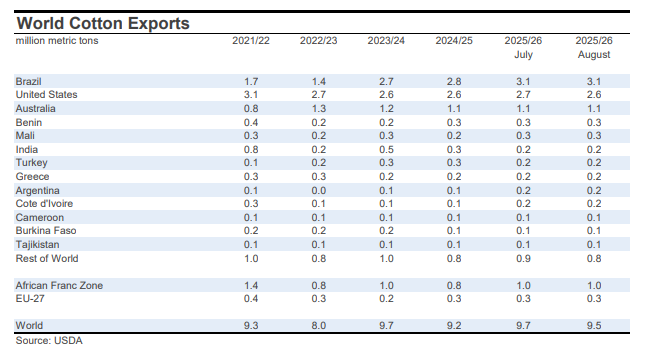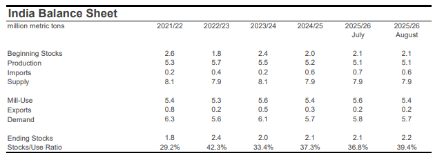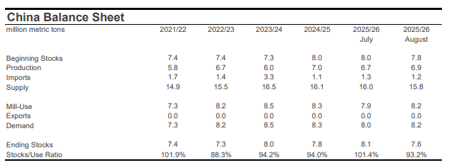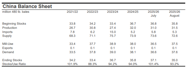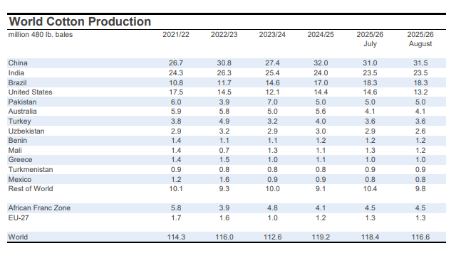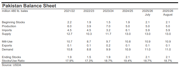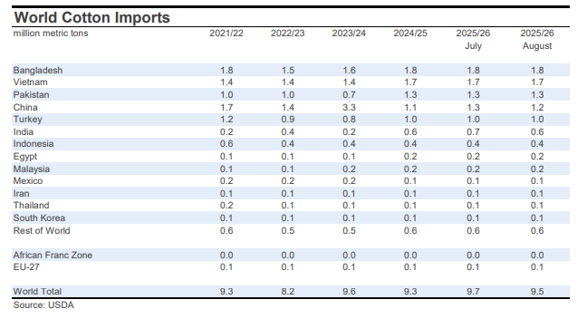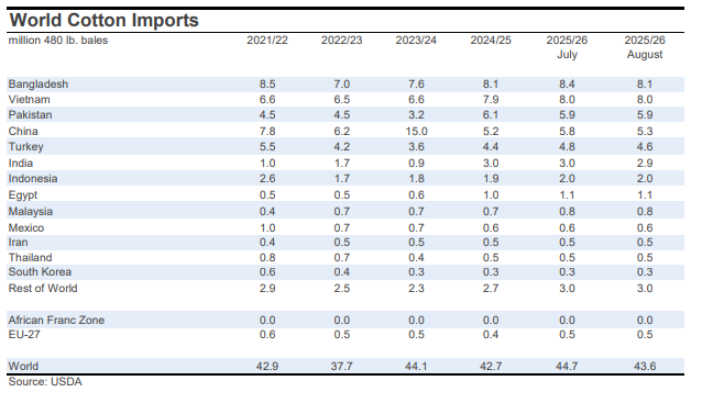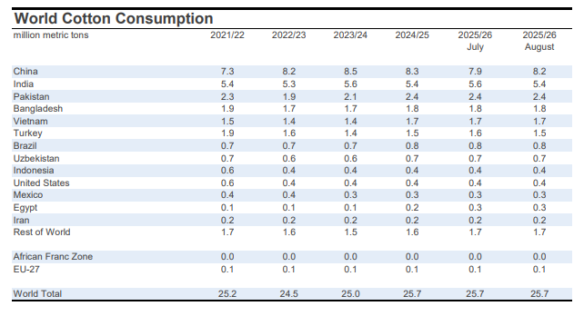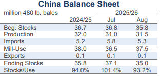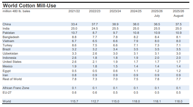 For mill-use, the largest changes included those for India (-500,000 bales to 25.0 million), Bangladesh (-300,000 bales to 8.1 million), Turkey (-200,000 bales to 7.1 million), Uzbekistan (-100,000 bales to 3.0 million), and China (+1.0 million bales to 37.5 million).
