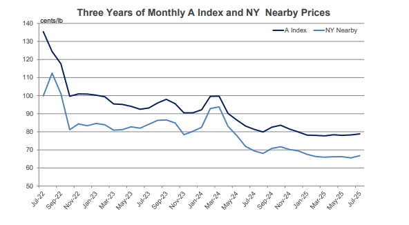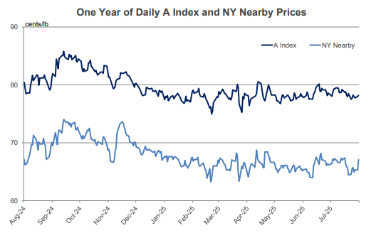 - The A Index was virtually unchanged over the past month, holding near 78 cents/lb.