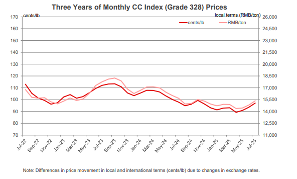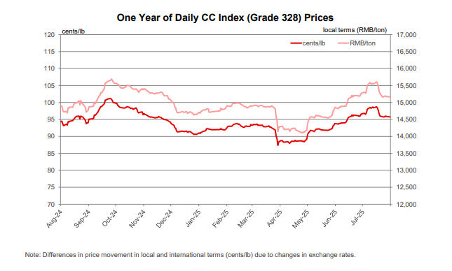 - After increasing between May and the first half of July, the Chinese Cotton Index (CC Index 3128B) flattened out and then decreased slightly. In international terms, values eased from levels over 98 cents/lb to those near 95 cents/lb. In domestic terms, prices eased from 15,600 to 15,100 RMB/ton. In May, domestic prices set lows around 88 cents/lb or 14,100 RMB/ton. The RMB was stable near 7.18 RMB/USD over the past month.