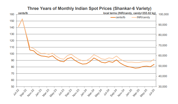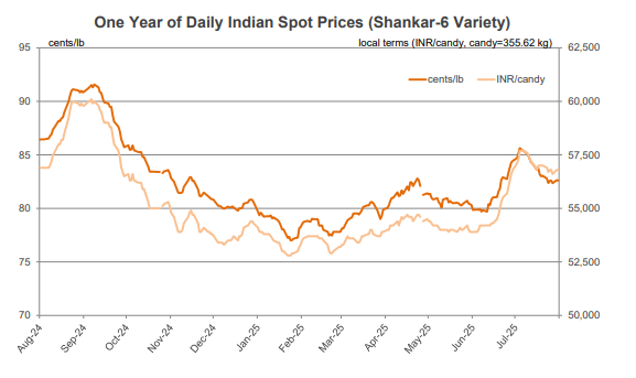 - Indian spot prices (Shankar-6 quality) generally traded between 82 and 85 cents/lb or between 56,600 and 57,700 INR/candy. The INR traded around 86 INR/USD.