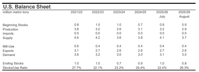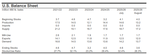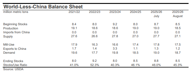 The largest country-level revision for production was for the U.S., where the crop estimate was lowered -1.4 million bales to 13.2 million. This was due to a drop in planted acreage (-840,000 acres month-over-month, to 9.3 million) and higher abandonment (from 14% to 21% month-over-month). Outside the U.S., the largest changes to production included those for Sudan (-450,000 bales to 150,000), Uzbekistan (-300,000 bales to 2.6 million), Mali (-100,000 bales to 1.2 million), and China (+500,000 bales to 31.5 million).