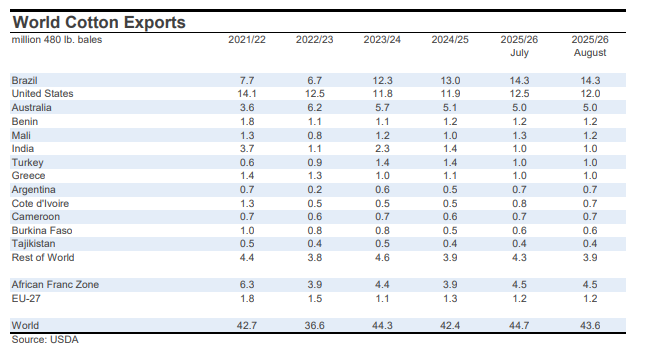The global trade estimate was lowered -1.1 million bales to 43.6 million. For imports, the largest changes were for China (-500,000 bales to 5.3 million), Bangladesh (-300,000 bales to 8.1 million), Turkey (-200,000 bales to 4.6 million), India (-100,000 bales to 2.9 million). For exports, the largest changes were for the U.S. (-500,000 bales to 12.0 million), Sudan (-400,000 bales to 150,000), and Mali (-100,000 bales to 1.2 million).