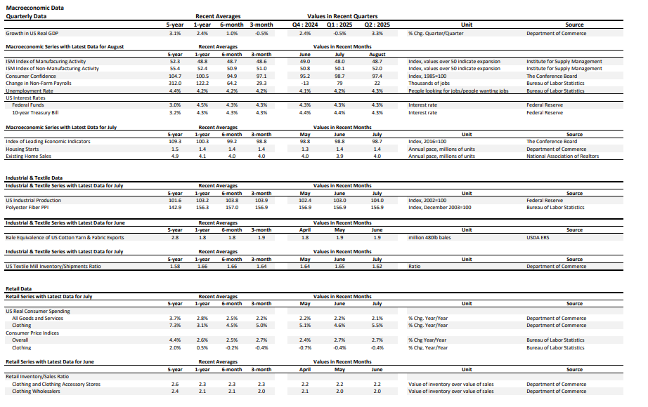 Consumer Prices & Import Data: On a monthly basis, average retail prices for apparel decreased in July (-0.4%). In terms of year-over-year change, the CPI for garments decreased for a fourth consecutive month (-0.5% month-over-month April, -0.7% in May, -0.4% in June, and -0.4% in July). Seasonally-adjusted cotton-dominant apparel imports were flat month-over-month in July at a level above the volume from May but below values over the previous six months.