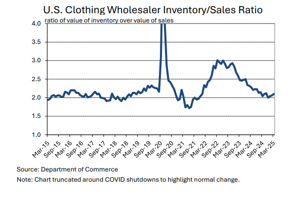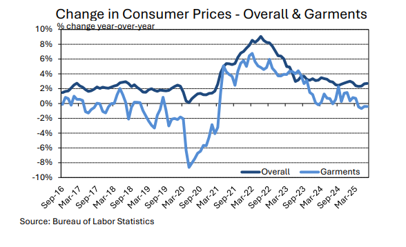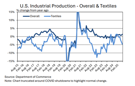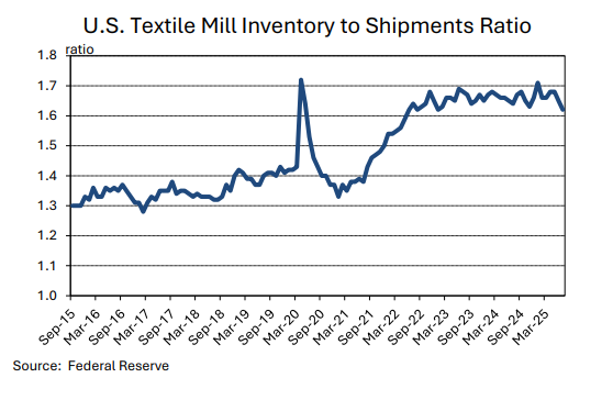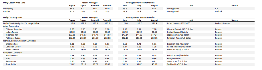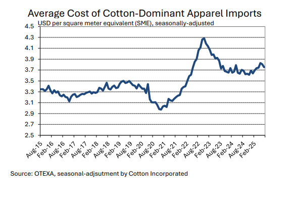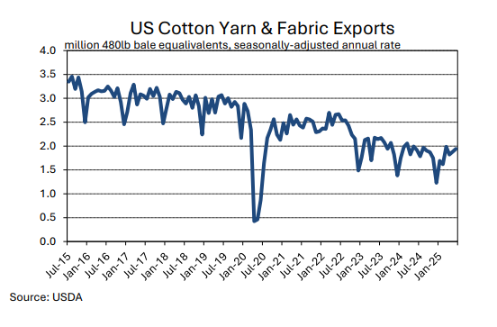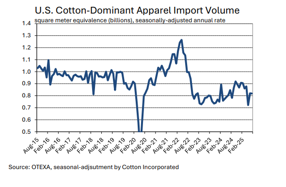 Both the breadth and pace of change complicates purchasing decisions, and the ultimate impact on global mill-use remains unknown. There could be implications for global economic growth in addition to any specific effect on U.S. apparel demand. U.S. apparel imports decreased in the few months of data available since tariff increase were implemented. In the first three months of the year, which may have been affected by front-loading ahead of potential tariffs, the seasonally-adjusted annual rate of raw cotton equivalence in U.S. imports was 13.5 million bales. Between April and June, the average was 12.7 million bales. This implies a decrease of six percent, but recent shipment volumes came soon after tariff increases were implemented and may not reflect longer-term reactions by retailers and brands.