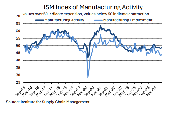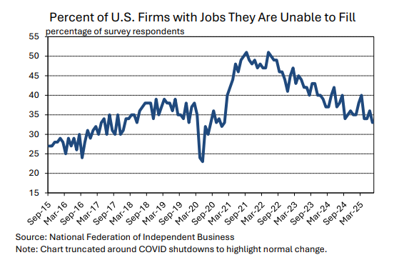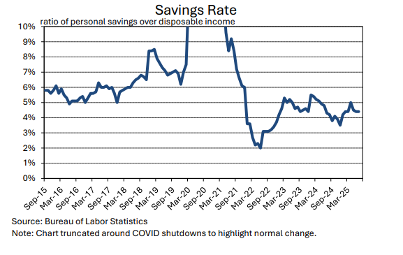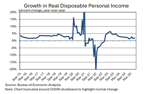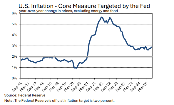 After trending lower from late 2022 through early 2024, inflation has been holding at levels between 2.5% and 3.0%, with the latest (July) reading coming in at 2.9% (data in terms of the core consumption-price-deflator that the Federal Reserve most closely targets). While this is significantly lower than the levels over five percent that were recorded in the summer of 2022, it is also above the Fed’s official target of two percent.