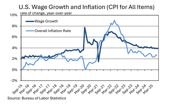 Year-over-year growth in wages was 3.9% in August. This is within the range between 3.9% and 4.2% that has contained wage growth since March 2024. In a nearly three-year period before March 2024, wage growth was consistently higher than 4.2%, reaching levels as high as 7.0% (March 2022).