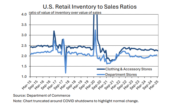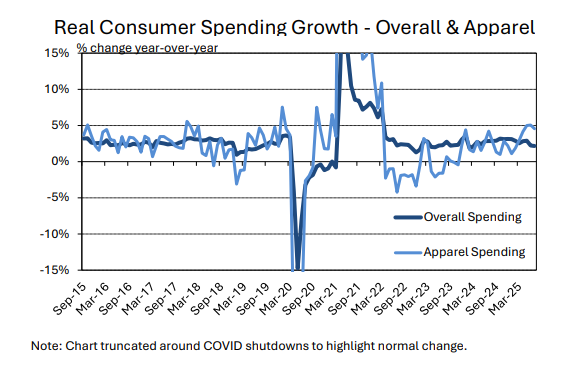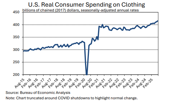 Spending on garments increased +0.8% month-over-month in July. This builds on relatively strong increases in May (+1.2%) and June (+0.5%). Year-over-year, spending on apparel was up +5.5%. That annual rate of clothing spending growth is the highest since 2022, when figures were distorted by the recovery after the pandemic. The longer-term average for year-over-year growth in apparel spending is near two percent.