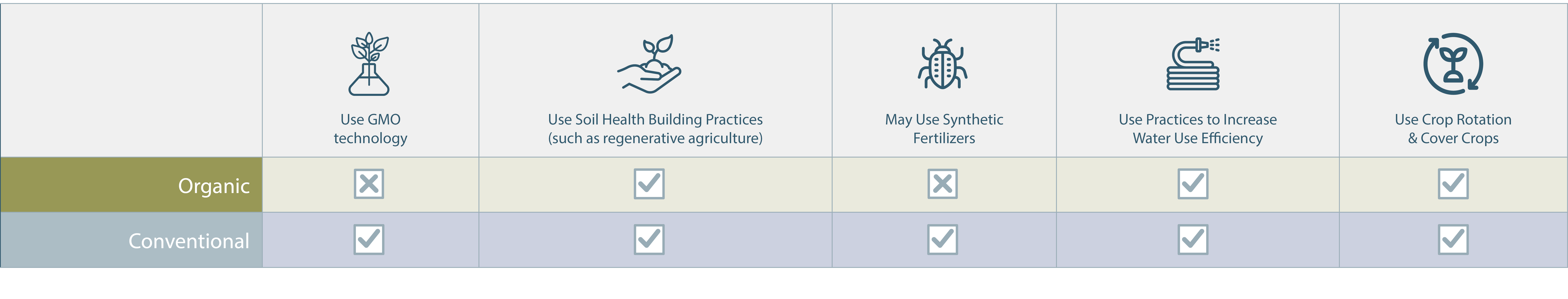 Typically, no. A crop’s production system (organic or conventional) does not determine its water requirements. Water needs are dictated by the farming region and the specific irrigation methods used. Both production systems can benefit from soil health practices, such as regenerative agriculture, cover crops, and diverse crop rotations, which help increase soil organic matter and water-holding capacity.¹²