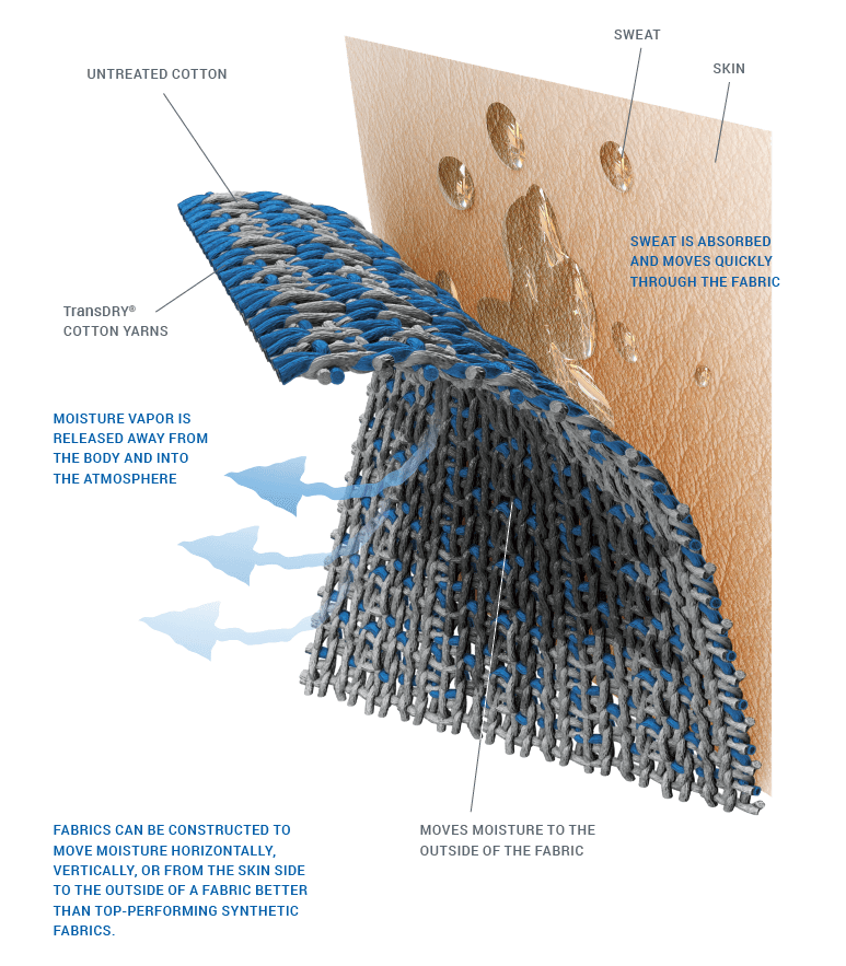 With the objective of maintaining dryness inside and transporting moisture away from the body, our Wicking Windows™ technology is achieved through print application of repellent coverage areas onto the skin side fabric surface. A new adaptation of this method incorporates phase change material for added cooling properties combined with moisture transport.