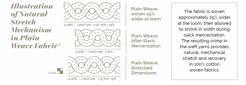 Mechanical stretch in cotton is created through precise control of cotton’s natural structure. During weaving, warp yarns are spaced approximately 25 percent wider than normal and then allowed to shrink in a controlled way during slack mercerization. This process sets a gentle spring-like configuration into the weft yarns, providing built-in flexibility and resilient movement that is permanently locked into the cotton fiber.